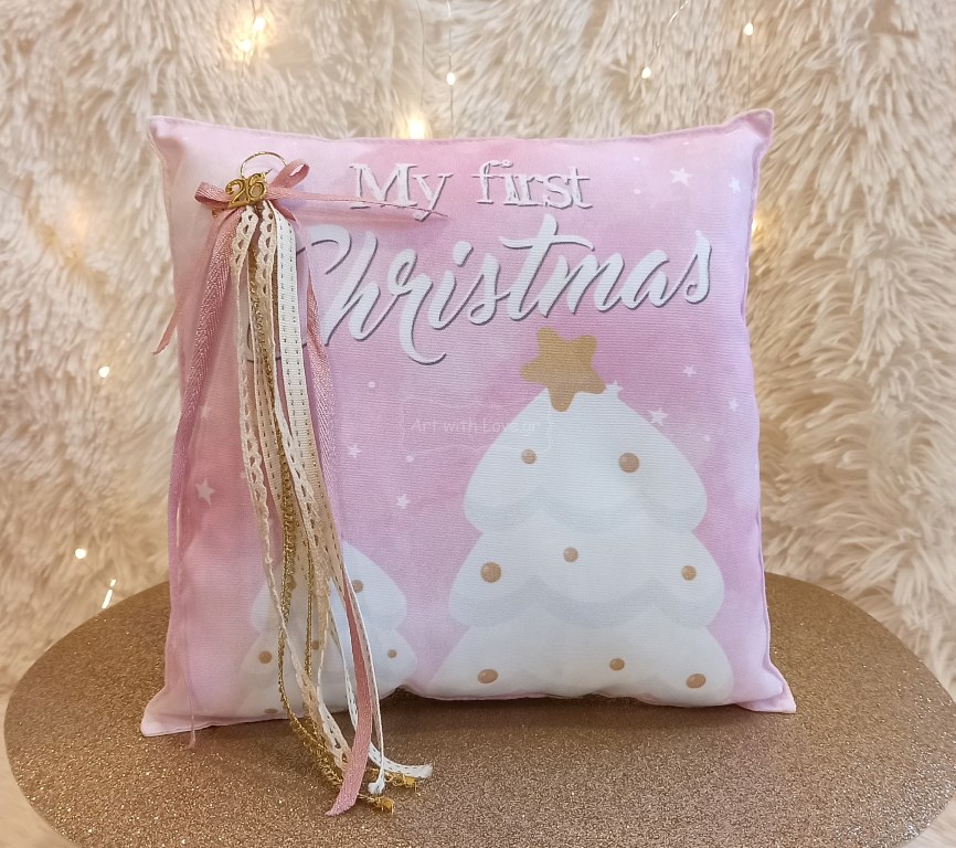 Ένα διακοσμητικό μαξιλάρι με εκτύπωση My First Christmas και παραμάνα με κορδέλες.