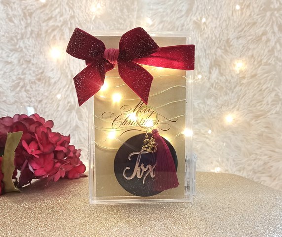 Γούρι μπρελόκ με φούντα σε Κουτί plexiglass και φωτισμό led με διακόπτη.