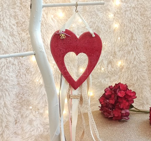 Κεραμικό γούρι κόκκινη καρδιά με διάτρητη καρδιά και κορδέλες.