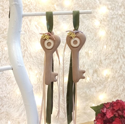 Κεραμικό γούρι μπεζ κλειδί με μάτι και κορδέλες.