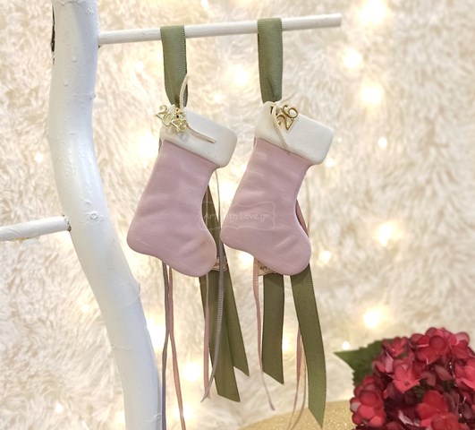 Κεραμικό γούρι ροζ μπότα με κορδέλες.