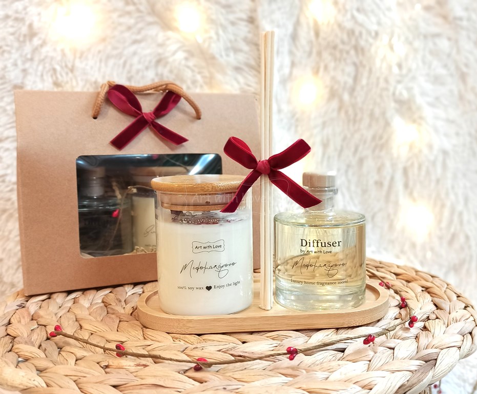 Το σετ αποτελείται από αρωματικό χώρου 100ml αργής εξάτμισης, κερί σόγιας 170γρ με το ίδιο άρωμα, sticks και δισκάκι.